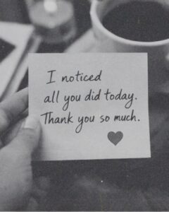 Leave a note on the table: “I noticed what you did today. It meant a lot.”