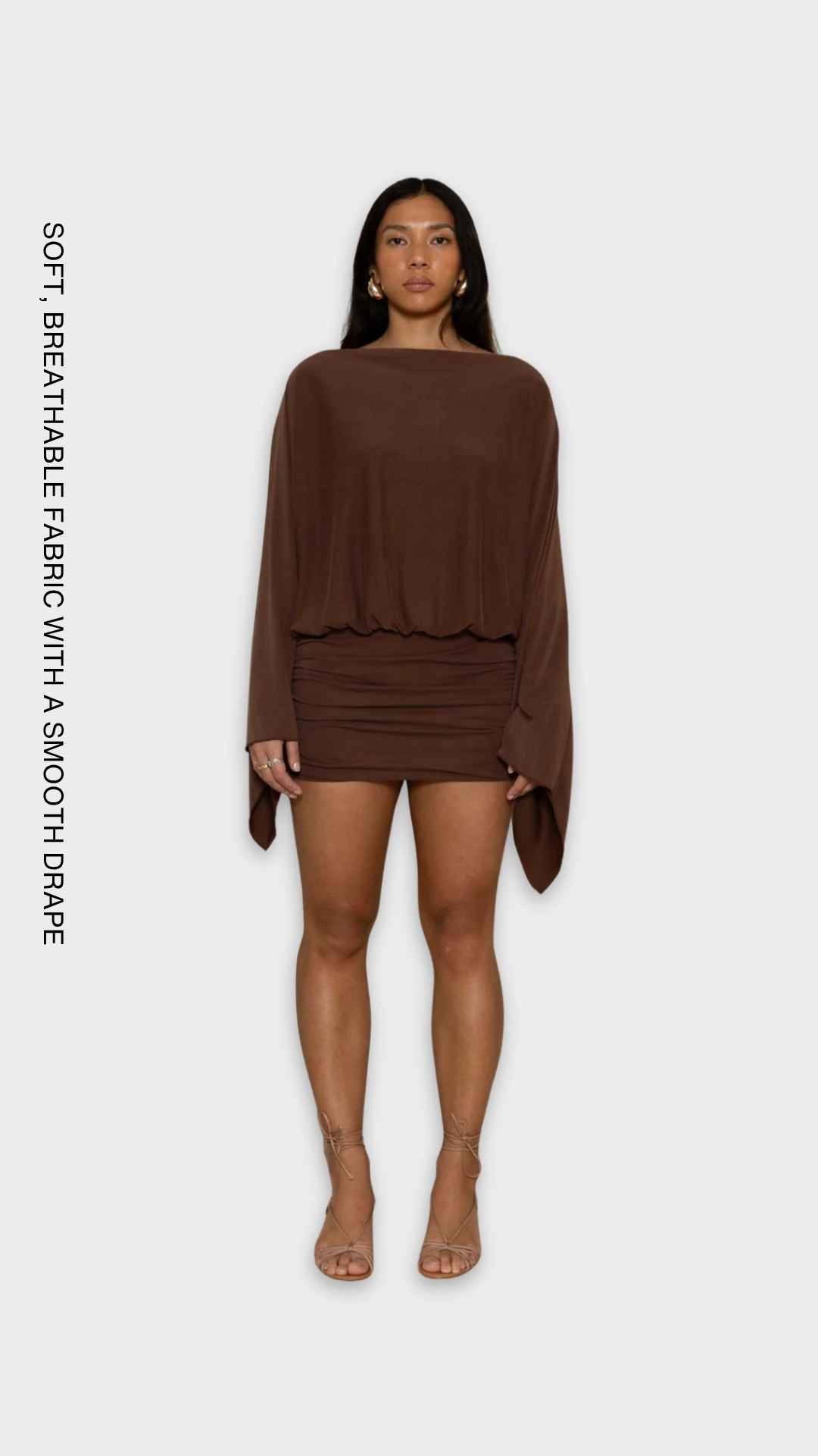 Designed as a piece you can dress up or down, The Sway mini version moves beautifully and sits comfortably on the body. The neckline can be styled slouchy-shoulder for a relaxed feel or worn higher for a clean, refined shape. Long wide sleeves and subtle ruching at the hips create an effortless, flattering silhouette.